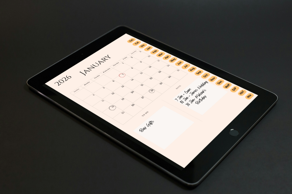• Full 2026 year-at-a-glance • 12 hyperlinked monthly spreads (click any date → jump to that week) • Reusable weekly & daily templates (duplicate as many as you want) • Habit tracker (8 habits × 365 days) • Clean sidebar tabs on every page – navigate in 1 second • Works perfectly in GoodNotes, Notability, Noteshelf, Xodo
